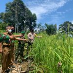 BARITO UTARA – Anggota Babinsa Koramil 1013-03/Teweh Tengah Serma Heri Cahyono bersama petugas PPL dan Sekertaris pok tan melakukan pengecekan tanaman padi