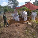 Landak – Babinsa Koramil 1201-10/Menyuke, Serda Slamet Suwaryo bersama perangkat Desa Untang mengawal pemakaman salah seorang warga Kecamatan Banyuke Hulu, Kabupaten Landak,