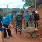 Landak – Babinsa Koramil 1201-07/Mempawah Hulu, Serda Edy Susiadi, bersama masyarakat melaksanakan karya bakti perbaikan jalan berlubang di Desa Sampuro, Dusun Bolat,