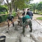 Landak – Koramil 1201-09/Sengah Temila bersama Perangkat Kecamatan, Desa dan warga Pahauman setempat bergotong royong memperbaiki jalan masuk kantor Kecamatan Sengah Temila,