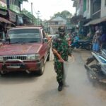 Landak – Anggota Koramil 10 Menyuke dan Tim Satgas Penanggulangan Covid-19 melakukan penyemprotan disinfektan dan memberikan imbauan protokol kesehatan di kawasan Pasar