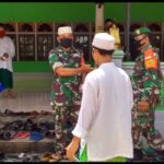 Landak – Anggota Koramil 1201-07/Mempawah Hulu, Serda Sapto Utomo dan Serda Saiful, melaksanakan pembagian masker kepada jamaah Masjid Nurul Bustanul Jannah di
