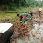Landak – Babinsa Koramil 12/Air Besar Serda Masnar melaksanakan pendampingan penanaman padi dalam rangka mendukung ketahanan pangan bersama kelompok tani di Desa