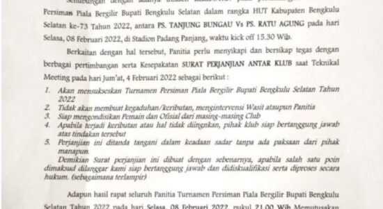 Bengkulu, Siberindo.co – Sehubungan dengan adanya insiden keributan pada pertandingan turnamen Persiman Piala Bergilir Bupati Bengkulu Selatan dalam rangka Hut Kabupaten Bengkulu Selatan