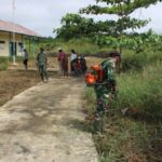 Satuan Tugas (Satgas) Pengamanan Perbatasan (Pamtas) RI-MLY Yonif 407/PK Pos Sei Tekam bersama masyarakat Desa Sei Tekam, Kec. Sekayam, Kab. Sanggau, membersihkan