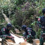 Satgas Pamtas RI-MLY Yonif 407/PK Pos Muakan bersama Masyarakat bahu-membahu melaksanakan karya bhakti memperbaiki akses jalan di Dusun Aboy, Desa Aboy, Kecamatan