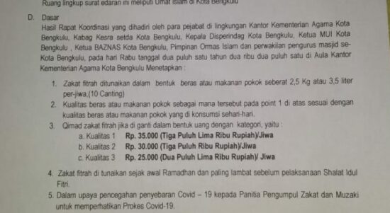 Bengkulu, Siberindo.co – Sesuai dengan surat edaran (SE) dari Kementerian Agama Kota Bengkulu nomor: B-708/Kk.07.04/BA.03.2/4/2021 tentang hasil rapat penentuan Qimad Zakat fitrah